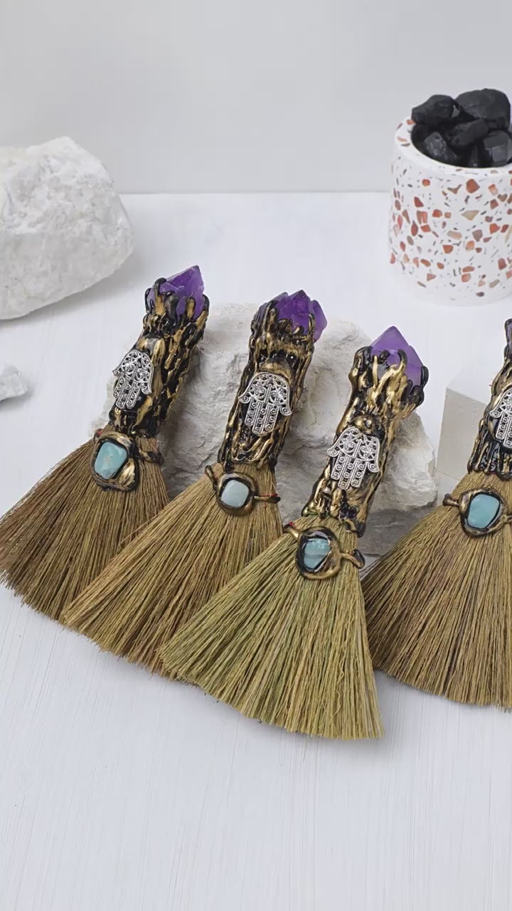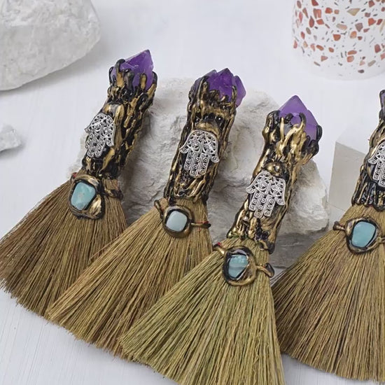 RYS A mini broom made of natural crystal, made from an amethyst tooth flower, a magical handmade broom decoration