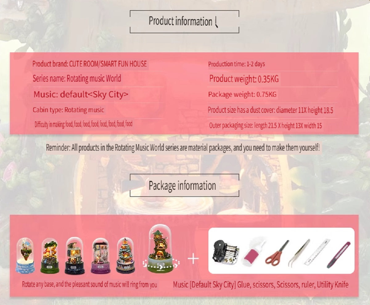 Please note: the product comes with a dust cover and a music movement (default music Sky City).Does not contain tools, batteries, glue.