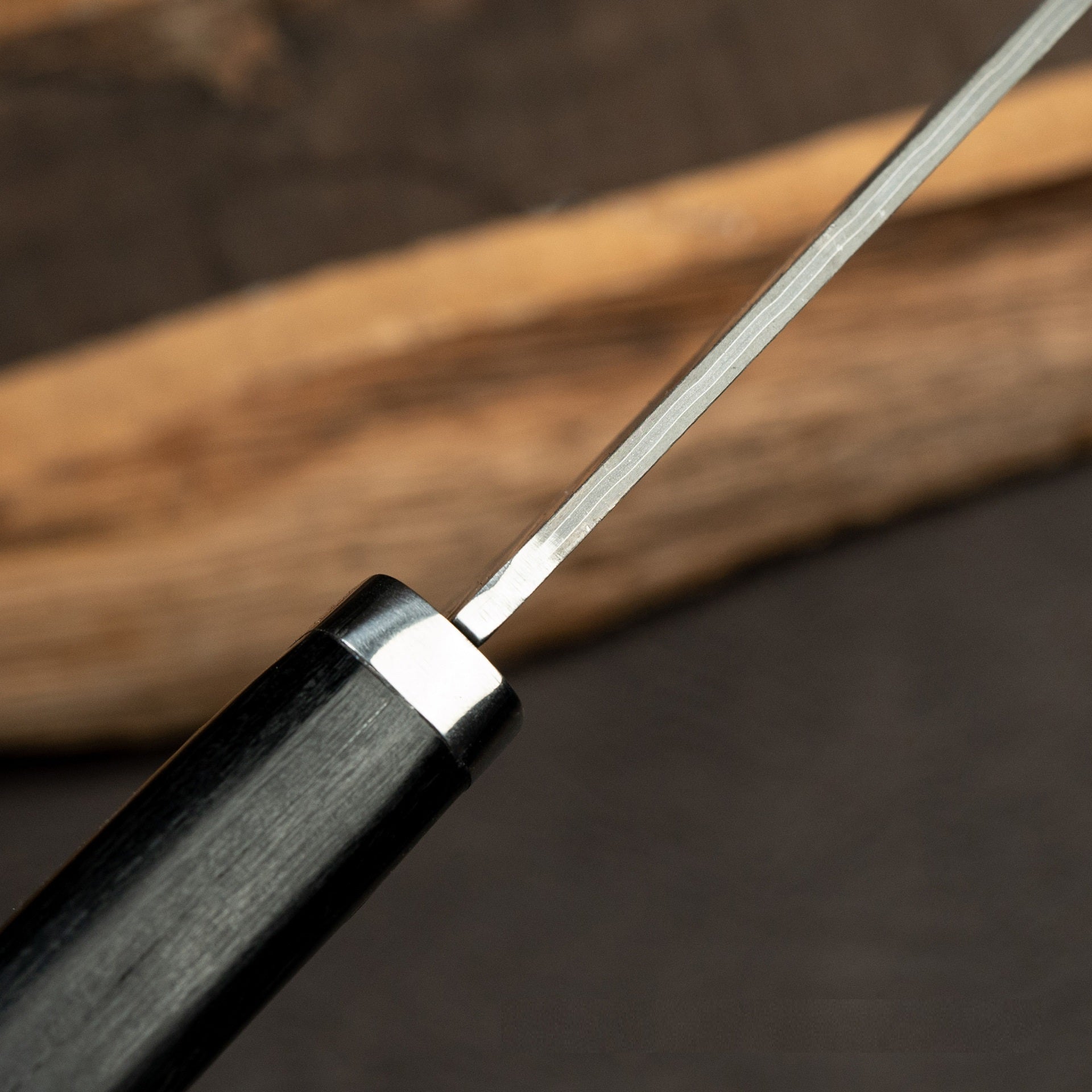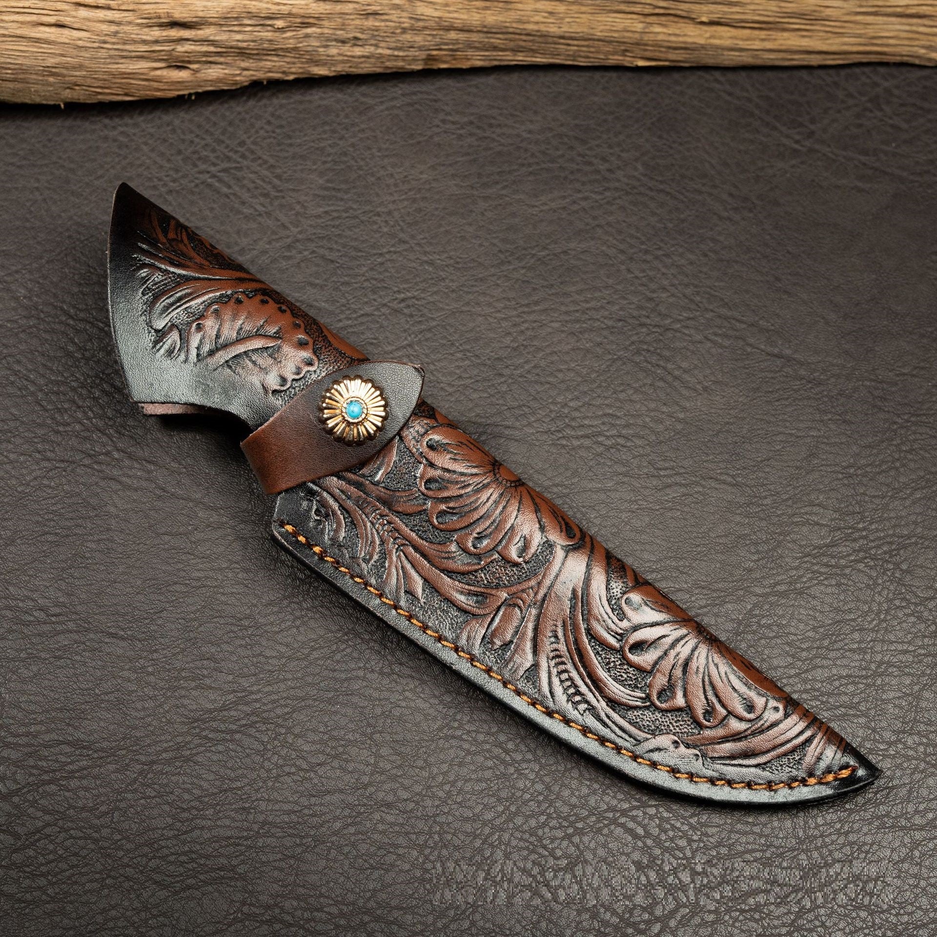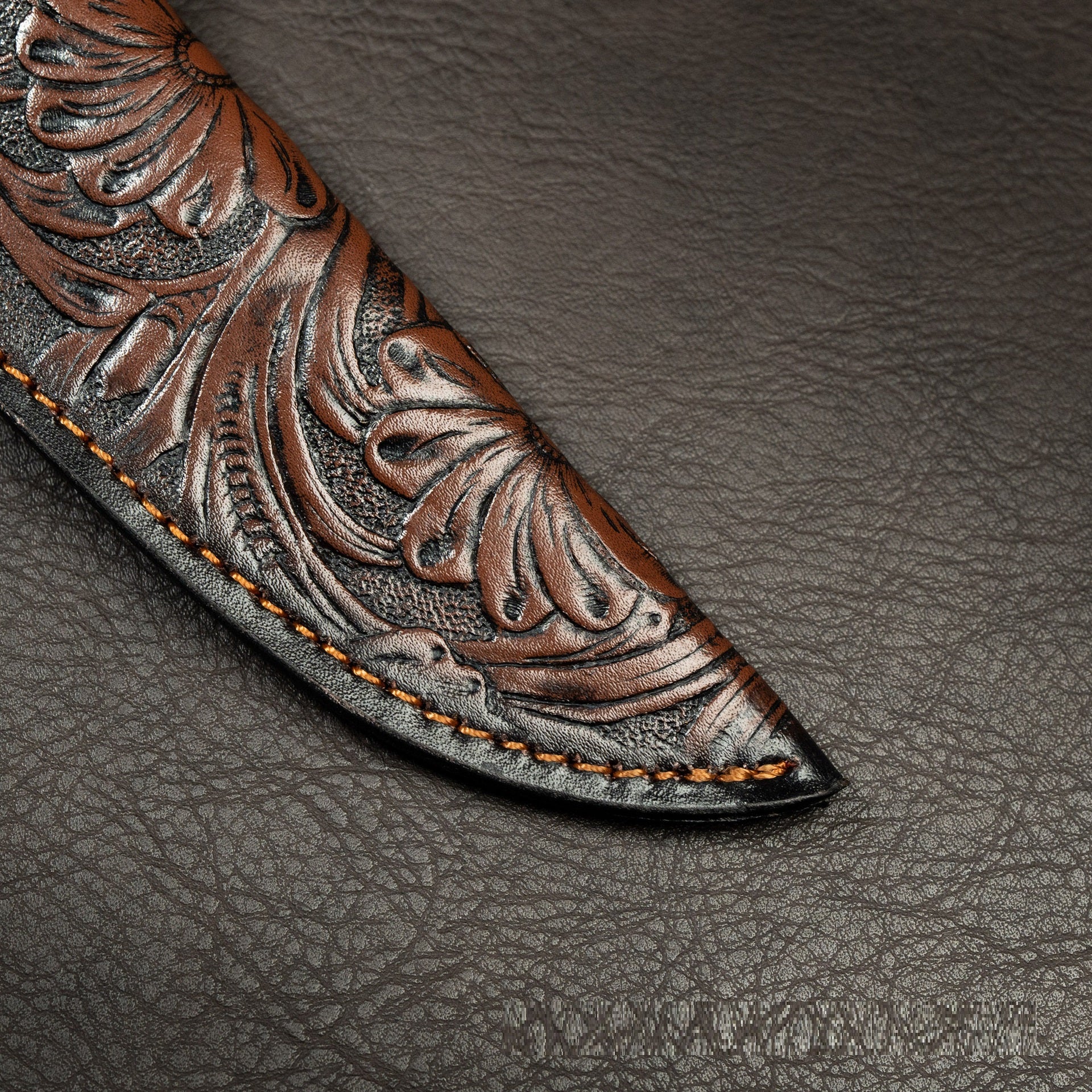 Description: This pocket knife is hand-forged from Damascus steel, offering exceptional hardness, wear resistance, and cutting performance. It features a non-slip, oil-resistant, ergonomically designed solid wood handle for a comfortable grip. It features a herringbone pattern. It comes with a leather sheath for convenient portability, making it ideal for outdoor use.