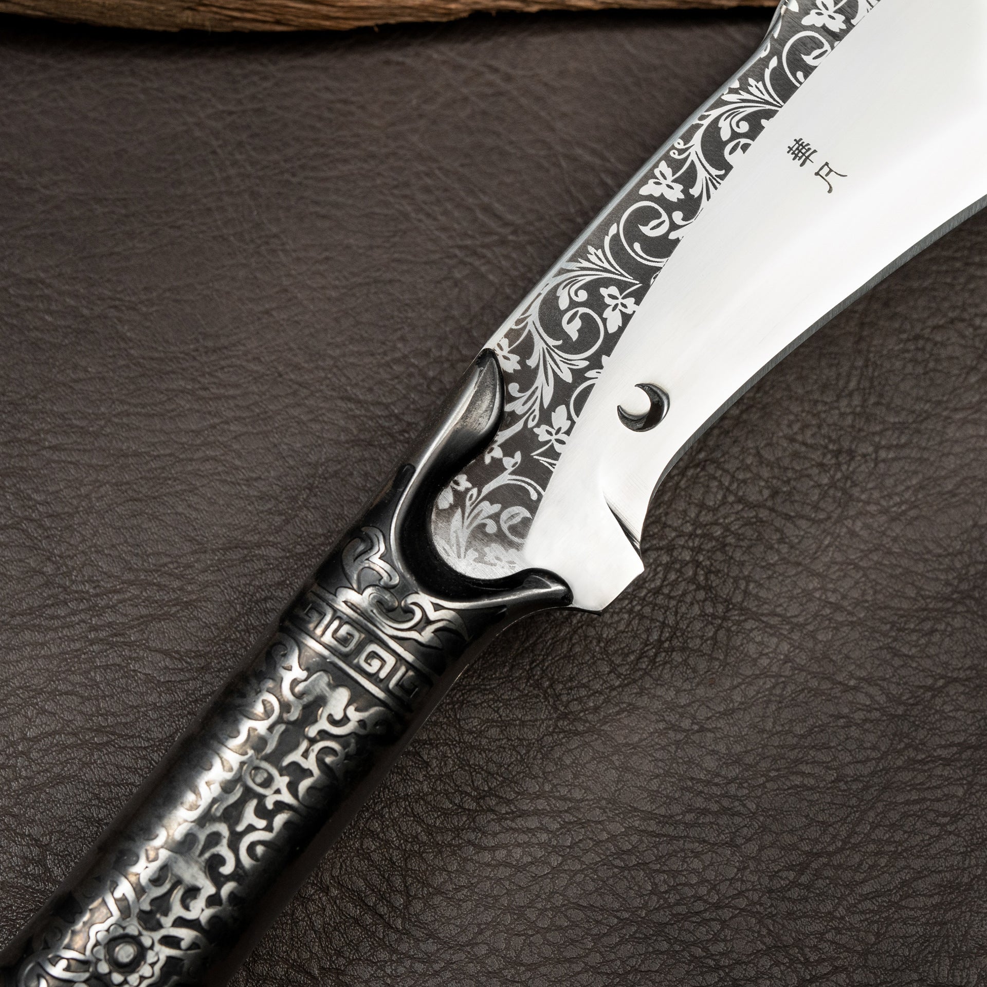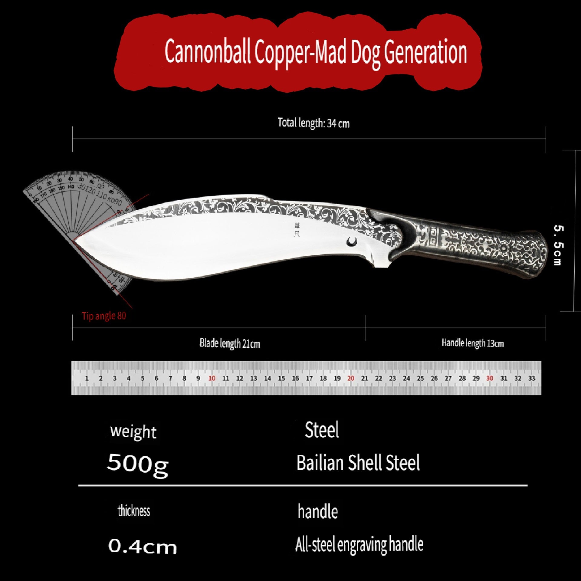 Description: This hand-forged knife embodies the classic "Mad Dog" style. Its curved blade places the center of gravity at the tip. The handle is crafted from cannonball steel and features an intricate engraving for a comfortable, non-slip feel. It's ideal for chopping, breaking bones, splitting wood, and carving meat, making it a practical tool, especially for outdoor use.