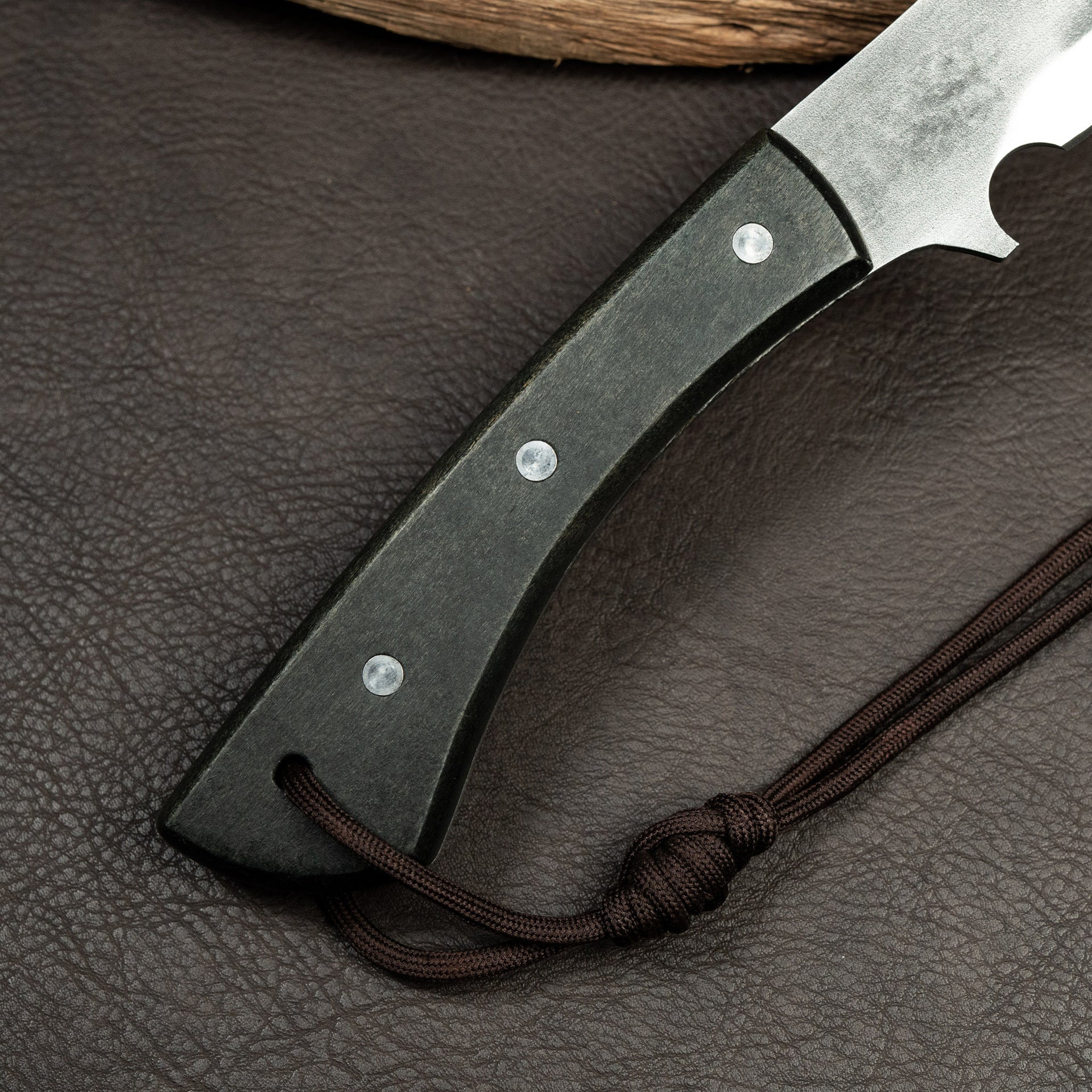 Description: This knife is hand-forged. The curved solid wood handle is comfortable and non-slip. The blade is thick to prevent curling, though not as sharp as a kitchen knife, making it suitable for chopping. The heavy head places the center of gravity at the base, making chopping easier. A leather sheath is included for easy portability.