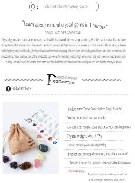 RYS Natural crystal cloth bag with rough stone, set of twelve constellations, handmade ore sample, gift for children